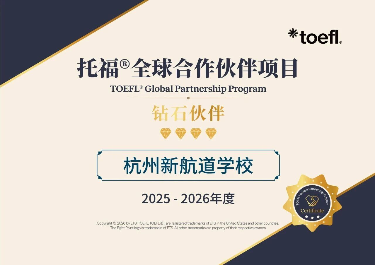作为托福官方长期合作伙伴,连续六年获授最高荣誉的合作伙伴奖(2020-2024:“托福联盟项目三星级成员”;2025:“托福全球合作伙伴项目钻石伙伴”),不仅展现了ETS官方对新航道的充分认可,更表明新航道在2025年托福考试培训中做出了杰出贡献。新航道杭州学校获托福全球合作伙伴项目钻石伙伴荣誉。