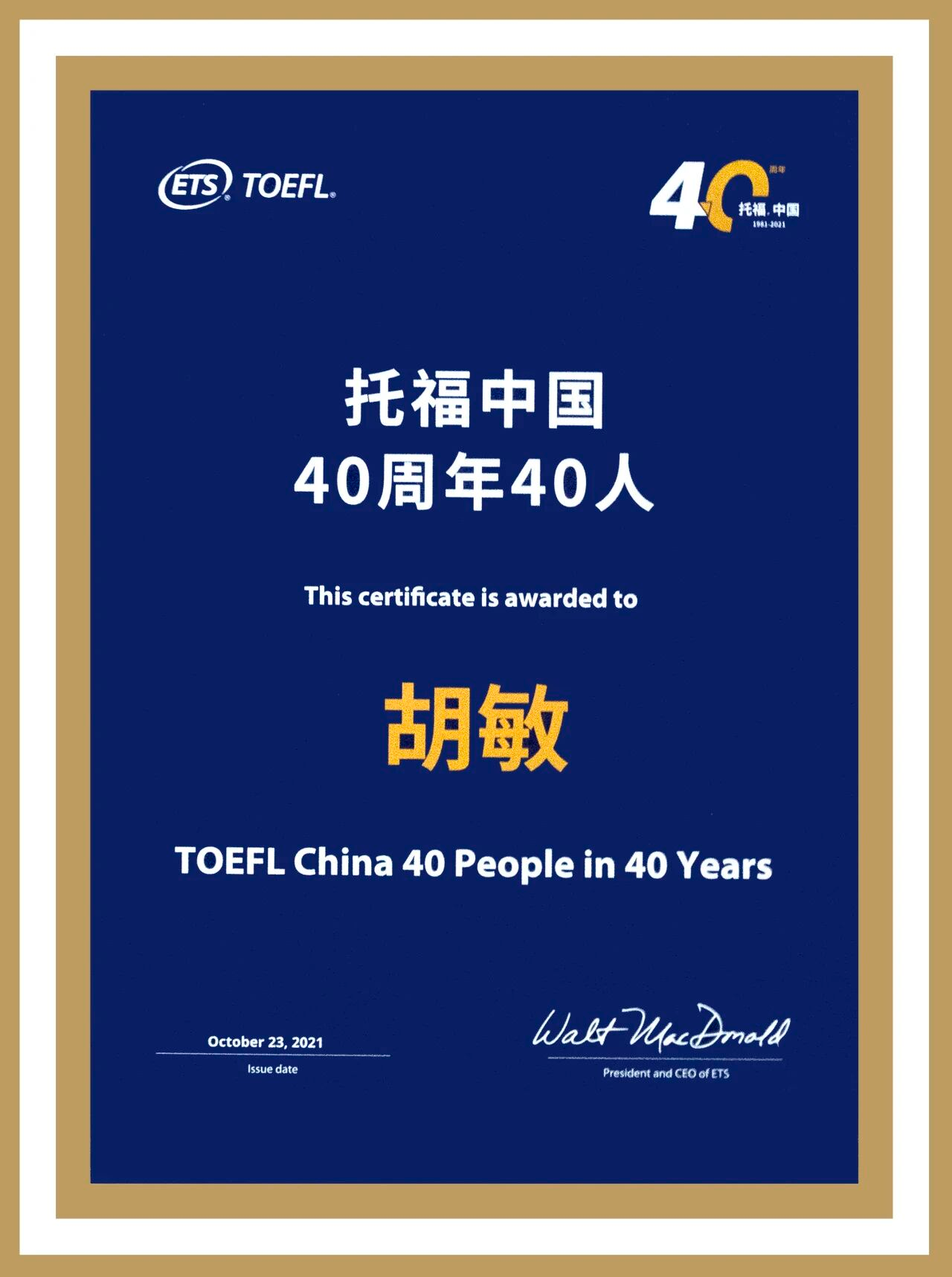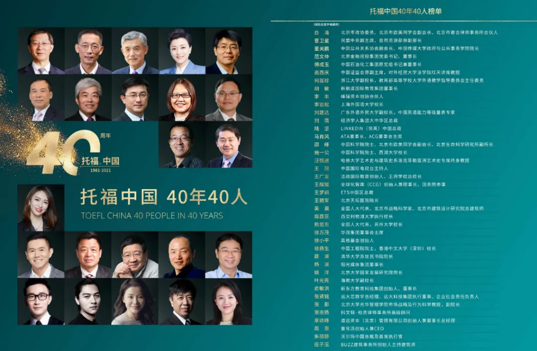 ETS中国在2021年10月23日于欧美同学会会址举办的托福和GRE进入中国40周年盛典上,联合欧美同学会发布“托福中国40年40人”榜单,以表彰过去四十年来四十位有代表性的留学生及对促进国际交流和国际教育发展做出突出贡献的代表人物。