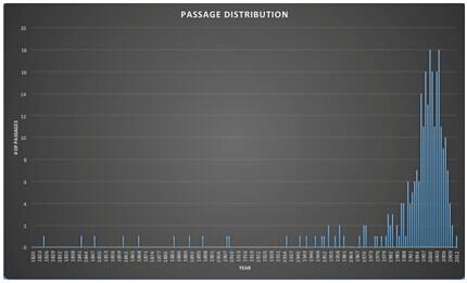 首先对SAT文章的出版时间进行分析(如下图)。图中X轴代表出版年份,Y轴代表该年SAT文章出版的数量。从图中我们可以发现一些有趣的现象,SAT所选取的文章中最早的出版时间是1820年,最晚为2013年。所选取的2007年出版的文章数量是10篇, 没有任何一篇文章选自1984年。