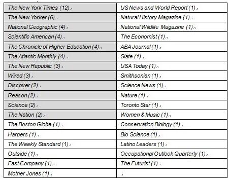 《纽约时报》(The New York Times)、《纽约客》(The New Yorker)、《国家地理》(National Geographic)、《科学美国人》(Scientific American)、《高等教育纪事报》(The Chronicle of Higher Education)、《大西洋月刊》(The Atlantic Monthly)、《新共和》(The New Republic)、《连线》(Wired)