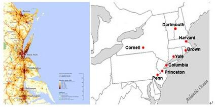 在这里设立总部的除了各大电视台,还有大部分金融机构,三个全国性的新闻机构(《纽约时报》,《华尔街日报》和《今日美国》),1/3的财富500强公司以及联邦政府。 除此之外,八所常春藤联盟中有六所都位于该地区(达特茅斯学院在新罕布什尔州,康奈尔大学在纽约州,距该地也不过几百公里,见下图)。