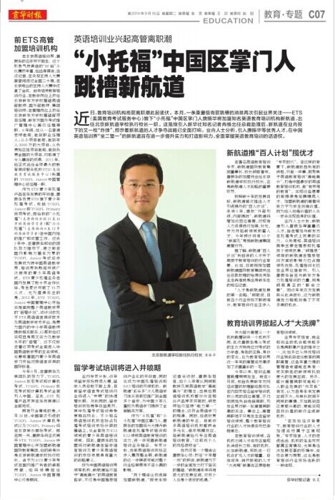 作为“小托福”和“小小托福”中国区,唐振华的加盟将大大新航道在托福考试培训和K12领域英语教育培训的实力,进一步完善新航道培训业务链条。专家分析,当前英语培训市场正步入震荡整合期,新航道的这一步棋很可能对整个行业格局带来不容小觑的影响。