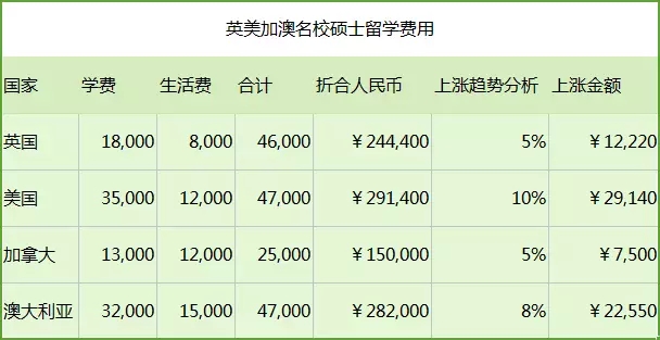 留学费用的国家是澳大利亚,这次澳大利亚赶超了新加坡,以每年25.2万RMB的姿态荣登榜首。大家最关注的美国留学费用排在全球第四,一年花费2.3592万英镑,相当于21.8万人民币。英国留学一年大概需要2.1万英镑,折合人民币19.4万人民币,仅次于美国。