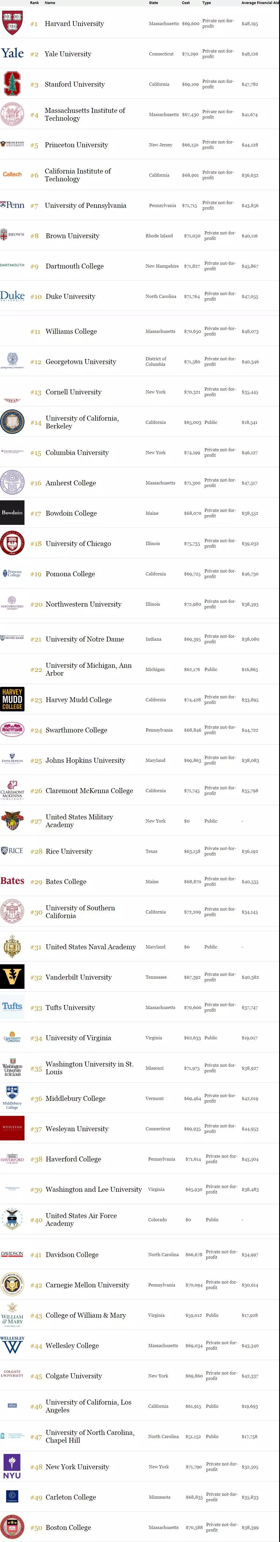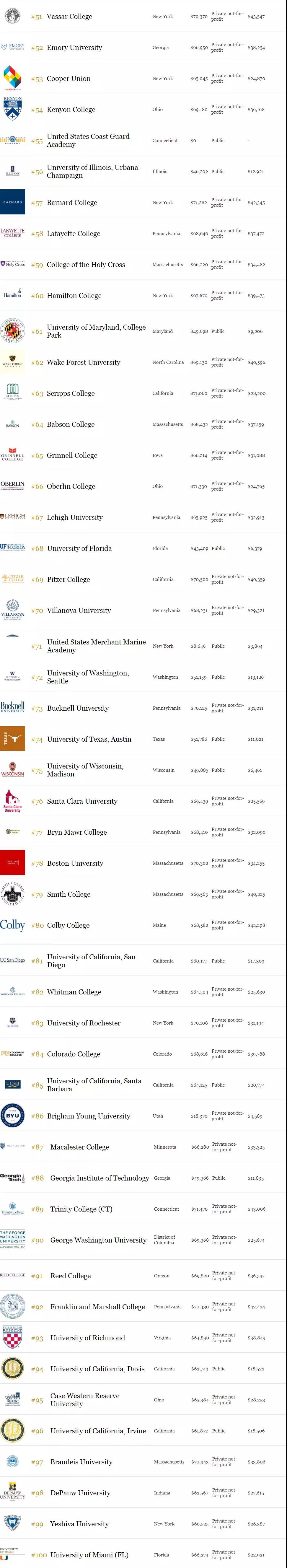 今年福布斯排名的衡量标准发生了一点变化,新增了美国名单指标。除了校友收入,福布斯还使用自己编制的数据来衡量美国大学毕业生的成功。数据来源包括福布斯400榜单,最富有的女性榜单,影响力的女性榜单和30岁以下精英榜单等。