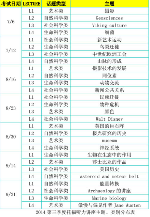 根据统计,2014第三季度托福听力讲座有一下特点: