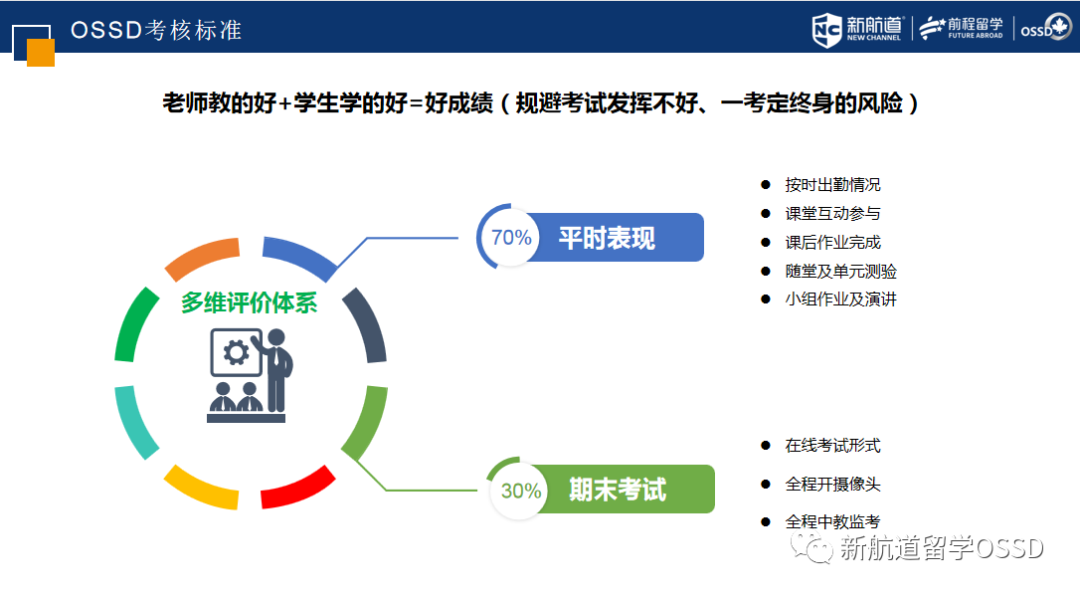 因为OSSD属于多维评价体系,平时作业成绩占70%,包括出勤、互动、作业、小组讨论等等,期末考试成绩只占30%,而且也是随堂测验的形式,而不是年度的大型考试。因此,只要学生平时保证出勤,按时保质完成作业,基本都可以获得好成绩。
