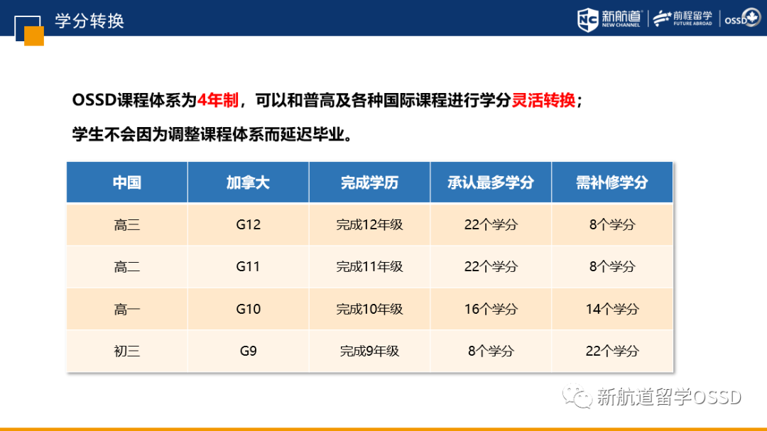 我们简单比较一下,国内的学生如何转换学分。因为OSSD课程是四年制,相当于国内初三到高三。如果你目前完成了国内初三,可以被承认8个学分,修22个学分即可,详见下表。