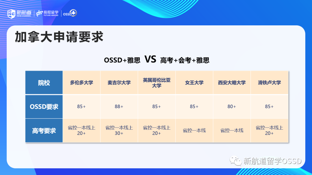 首先来看申请加拿大大学的要求,对于我们熟悉的医博类前三——麦吉尔、多伦多、UBC,OSSD的要求需要均分85以上,而国内高考最低要求在一本线以上20/30分以上。像其他院校如麦马、西安大略、渥太华,OSSD只需要在83分以上即可。