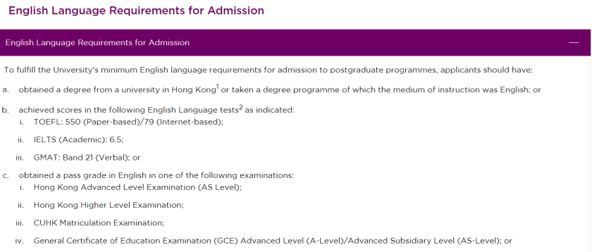 图为香港中文大学(CUHK)对授课型硕项目申请的基本英语要求