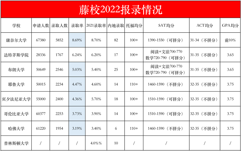 随着新申请季的开启,美本高校陆续公布了最新的录取数据,我们整理了2022年藤校申请数据,即将申请美本的同学们可以参考。