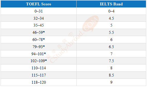 此转换表仅供参考。学生们可以了解下所考的分数在不同类型英语考试中的水平。