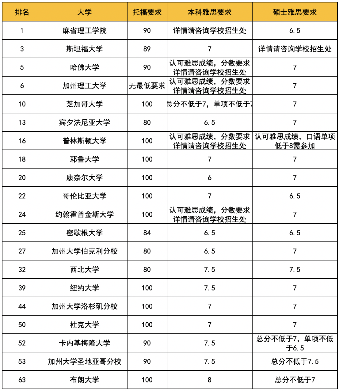图中可以很明显的看到美国高校的研究生雅思成绩录取要求集中在7分,只有少数需要6.5分。而美国高校对托福成绩的要求一般也在100分左右,有的甚至会更低一些。