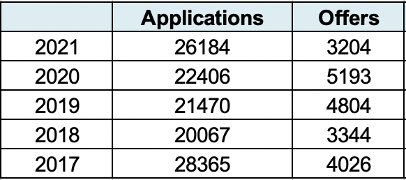 根据LSE伦敦政治经济学院录取数据显示,2021入学季,总申请人数仍然继续增长,达到26184人,发放offer 3204 封,最终录取1775人,录取率约12.2%。在近五年中,申请LSE 的人数增长了约 42.6%。