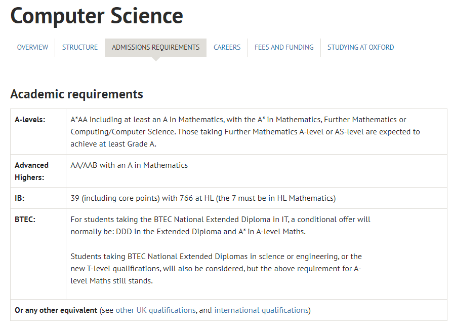 那么牛津大学计算机专业对于A*AA的要求,对应来自美国的学生申请就是:AP考试4门5分(其中有必须考的科目——数学或者计算机);或者3门AP考试5分(包括数学或者计算机)再加上至少32分的ACT或者1470以上的SAT成绩。那么IB的对应的成绩要求就是39分,HL科目成绩为7分、6分、6分,其中HL数学必须是7分。