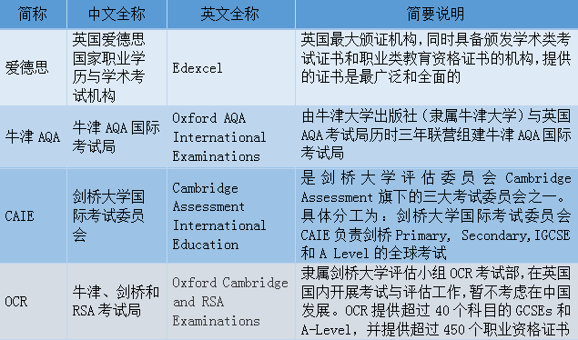 其中有4大考试局是普遍使用的,它们分别是:EDEXCEL、CAIE、OCR、AQA。