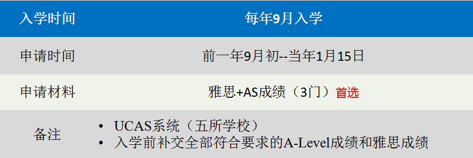 申请英国学校可以在入学前补交全部符合要求的A-Level成绩及雅思成绩。英国的入学时间一般是每年的9月,申请时间为前一年的9月初至当年1月中旬。申请材料为雅思成绩和AS成绩(3门)。