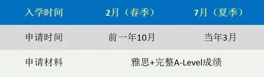 澳大利亚大部分院校需要有完整的雅思和A-Level成绩才能提交申请。澳大利亚有两个入学时间,一个是春季入学(每年2月),申请时间为前一年的10月;另一个是夏季入学(每年7月),申请时间为当年的3月。