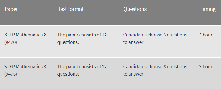 由于2021年开始,STEP 1被取消,所以只剩下STEP 2和3两份试卷。这两套试卷均为纸质考试,且每套试卷的考试时间均为3小时。考生通常需要参加其中一项或两项考试,这取决于他们所申请的大学的要求。