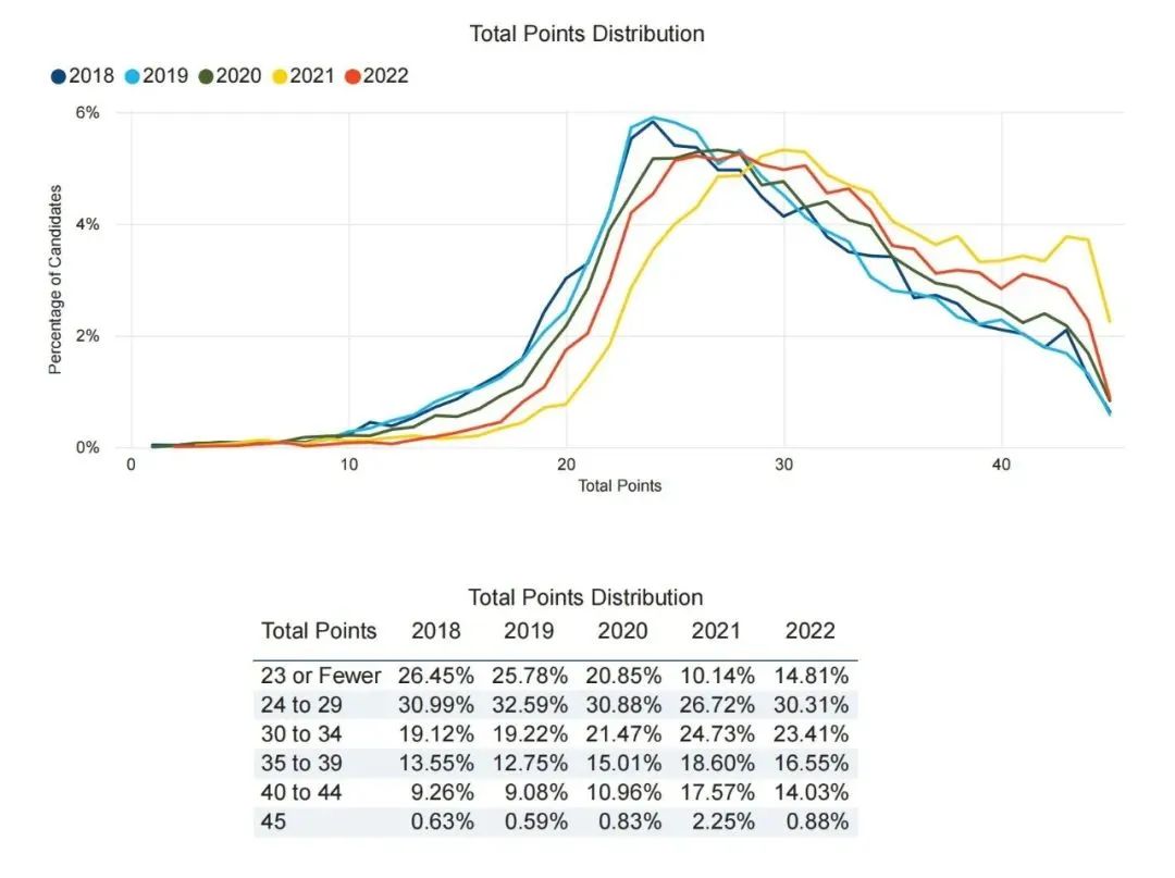 2019年前平均分在28.5左右,21年猛增到32.31,22年有所回落,到23年应该会持续走低。