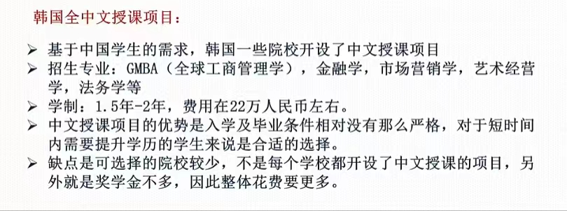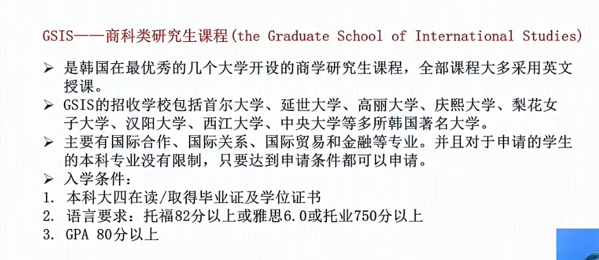 硕士阶段可以考虑GSIS也就是商科类研究生课程以及韩国全中文授课项目。