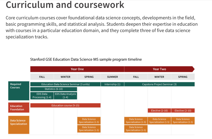 学生至少修读18门课程或51个单元:9门来自核心课程,3门来自教育基础课程,至少6门来自至少3个数据科学专业领域。在第一年学习后的暑假,学生完成实习。学生还在GSE教员的指导下完成一个定点项目。