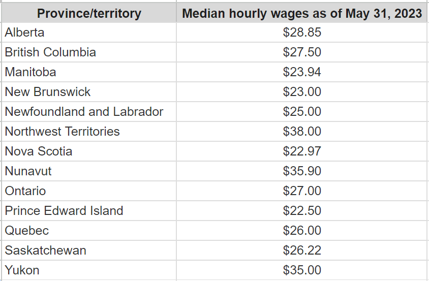 加拿大每个省份/地区时薪中位数